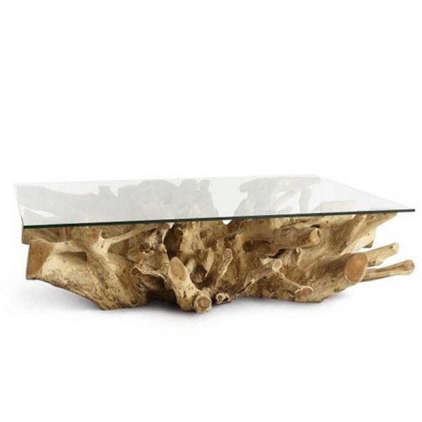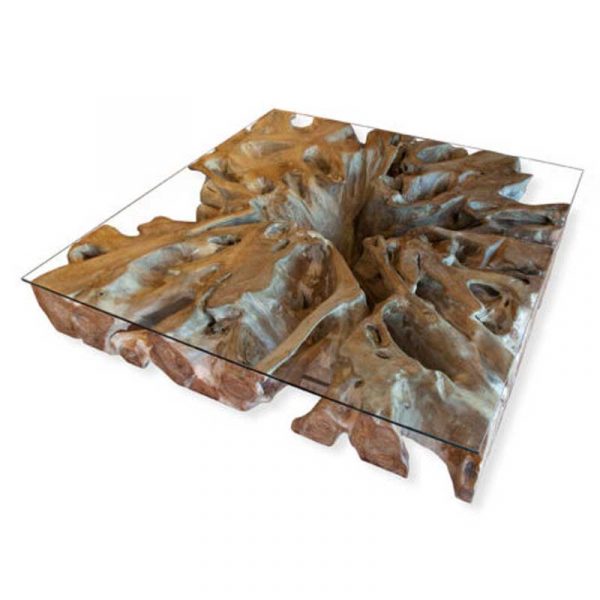 Mesa de 100 x 100. Mesa raiz de arbol de teka. Incluye cristal.